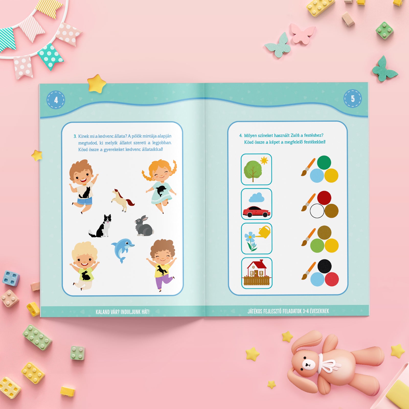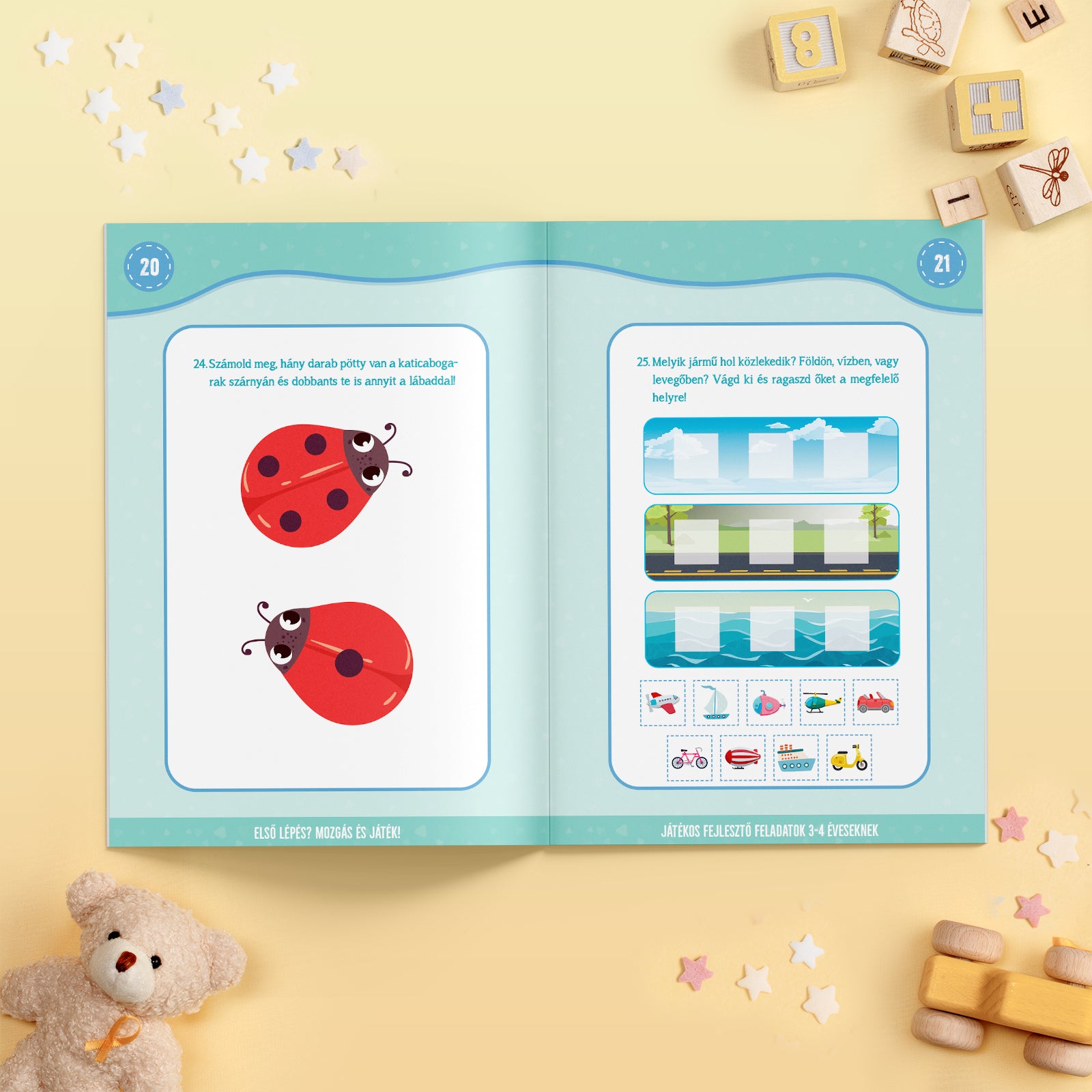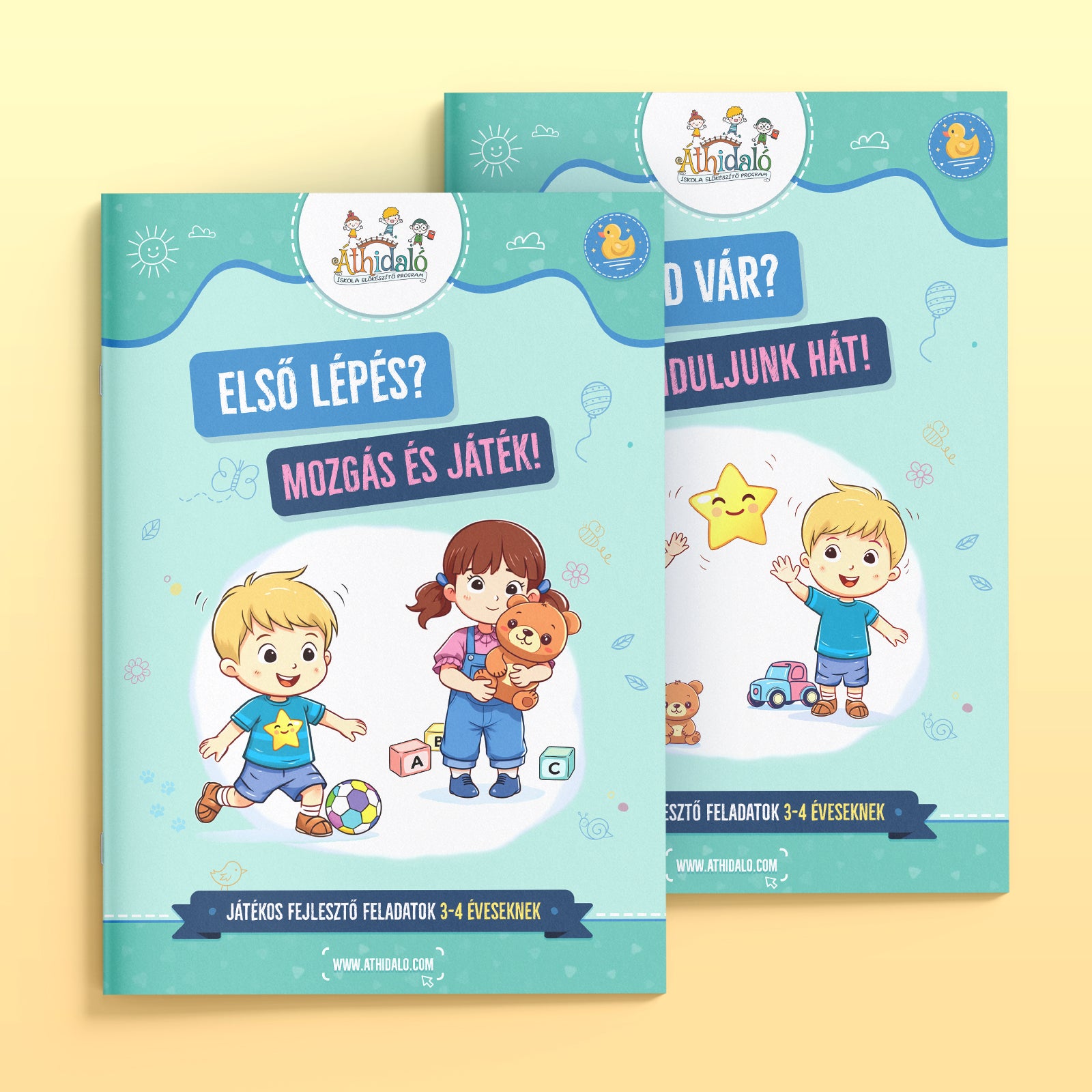 Játékos, mozgásos feladatok 3-4 éveseknek, két A5 füzet formájában. Színek, formák, párosítások, egyszerű vonalvezetés és mozgásos tevékenységek– minden, ami az első „ügyes lépésekhez” kell.